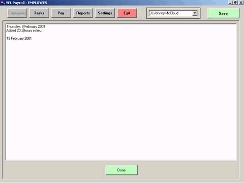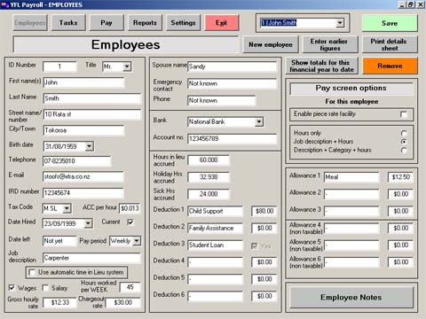 Employees screenInformation on your employees is extensive. The type of pay screen to be used is set here and can be different for each employee as needed.