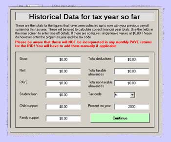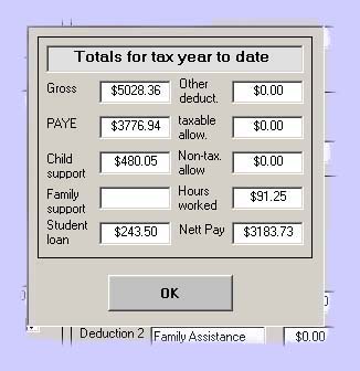Regular deductions and allowances are entered here and will show up in each pay record automatically. Once there you can alter these, remove them or add one-off items in the final pay screen A unique 'Time in lieu' system is available where your employee has a set number of hours per week (in this instance 45). If he or she works more than this the hours are not paid but kept 'in lieu'. If for some reason the employee can not work a full week the 'time in lieu' can be used to top up the pay. This is particularly useful for weather dependant jobs like building. The IRD number will be automatically verified avoiding errors. Many fields will auto-fill when tabbed past. A sub-screen to enter the amounts for the year to date is accessed from here.