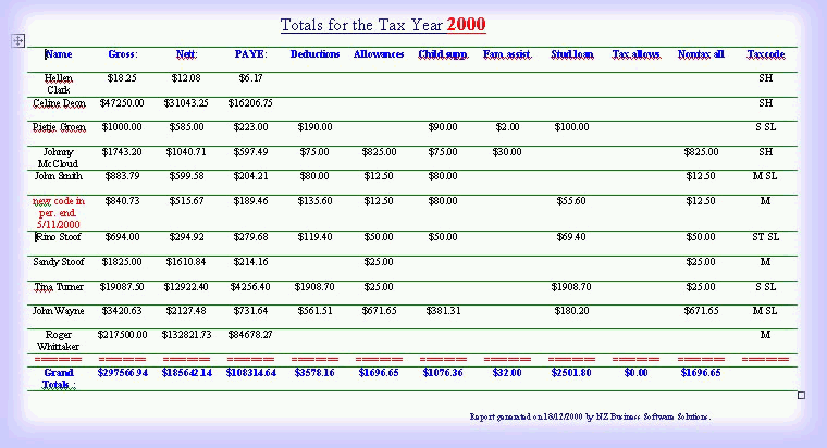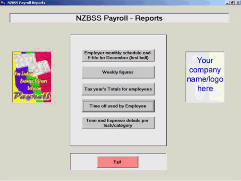 Tax year totals will give you all figures for the year to date. (The red text indicates that John Smith changed his tax code from 'M SL' to 'M' in the period ending 5/11/2000) The Time off report shows how much time off was used by a particular employee (holiday, sick and time in lieu in hours) The Detailed hours per project by time and category will give a large number of combinations of tasks, category and timeframe. Both cost and charge out are shown where applicable. We can see that Roger Whittaker's rate is perhaps somewhat excessive! Home | Employees screen | Pay screen | Reports | Settings | Task & categories | Contact us /Trial |