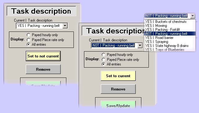 The YES in front of the tasks indicates that all tasks are current and will show up in the pay screen. If set to not current NOT will show (see below) and the task will not show in the pay screen. It can however still be used in the reports.